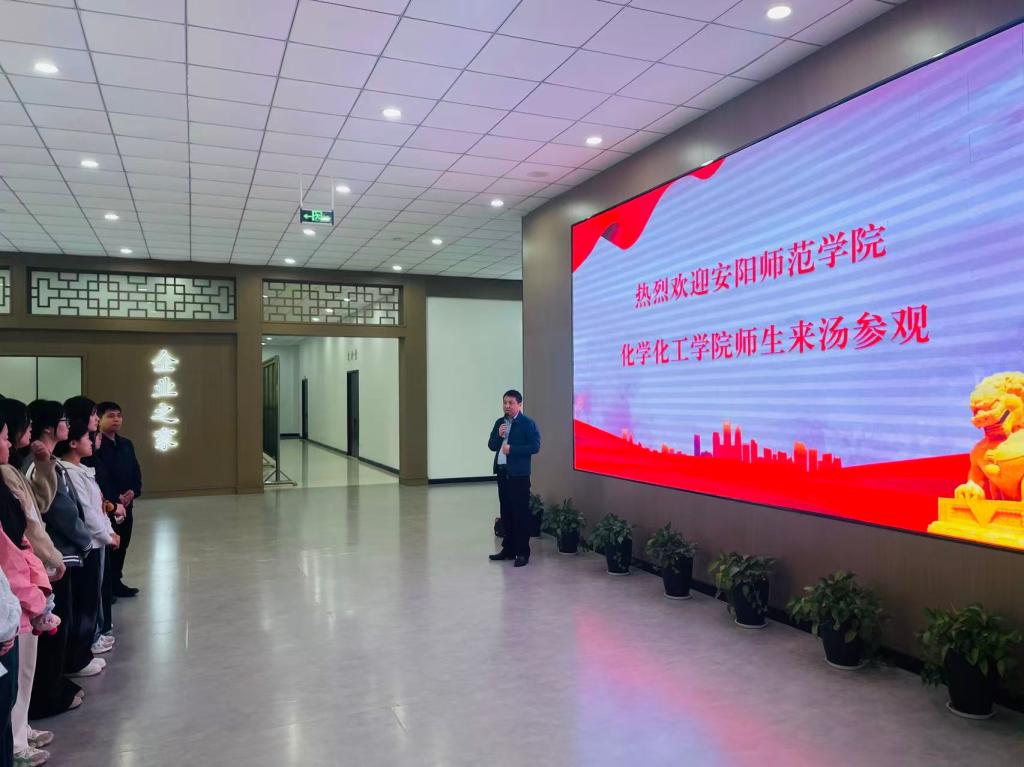 9月25日,安阳师范学院化学化工学院师生受邀走进汤阴县医疗器械产业园区,与河南金百合生物科技有限公司、安阳仁华制药有限公司等企业开展专场招聘对接活动。园区办公楼大厅内,电子屏滚动播放着欢迎标语,现场氛围热烈。