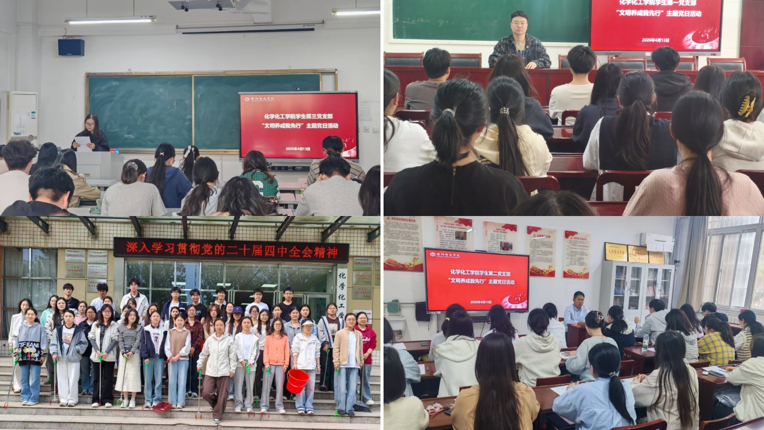 为落实学校党委部署,彰显学生党员先锋模范作用,4月13日下午,化学化工学院学生一、二、三支部分别在化工楼217、132、237教室同步开展“文明养成我先行”主题党日活动。参与人员为全体学生党员及全体入党积极分子,活动由各支部书记主持。